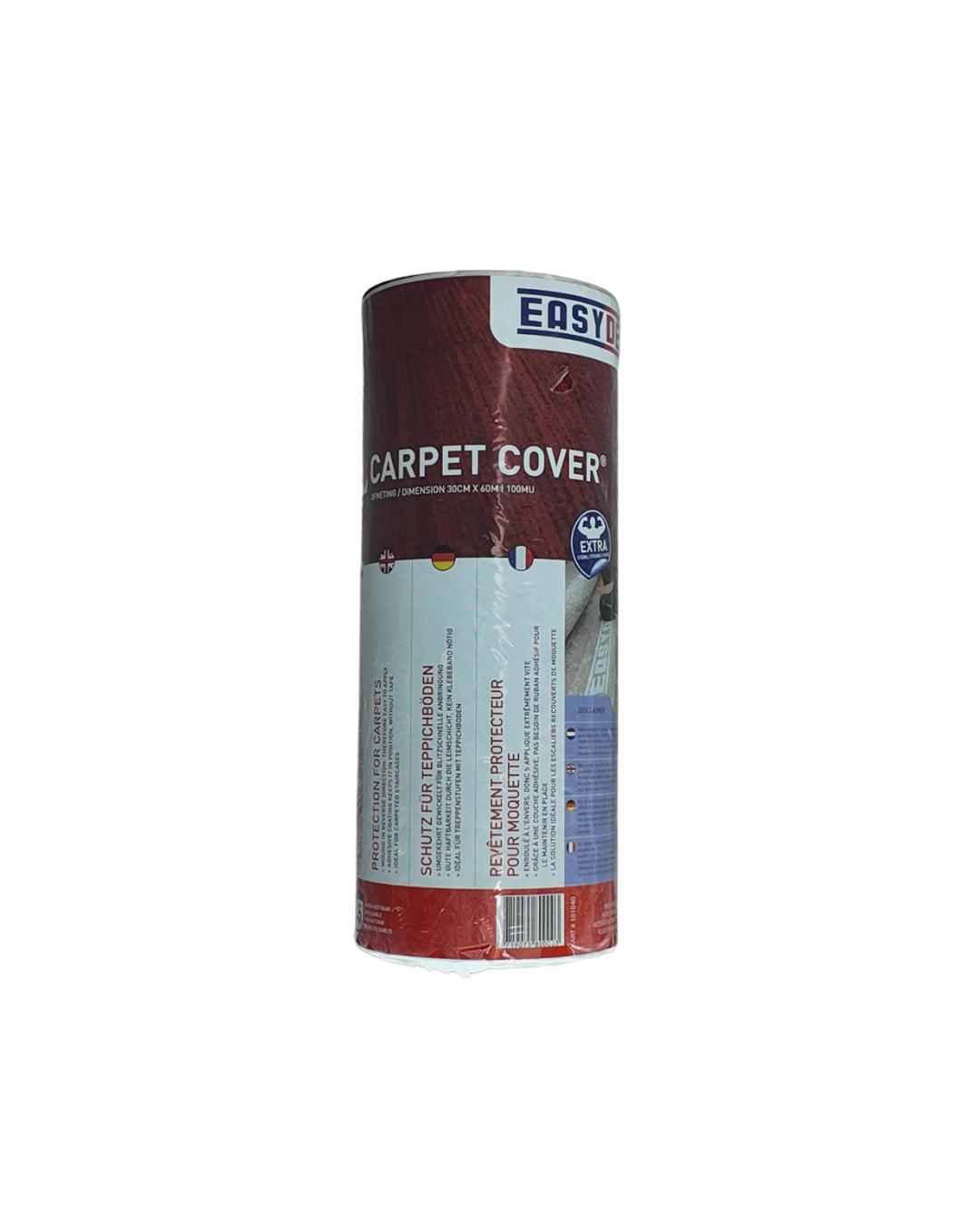 Carpet Cover 30 cm x 60 m 100mu is een sterke, zelfklevende afdekfolie voor de tijdelijke bescherming van tapijt, tapijttegels en gestoffeerde trappen. Ideaal voor smalle doorgangen en traptreden waar betrouwbare tapijt bescherming vereist is.