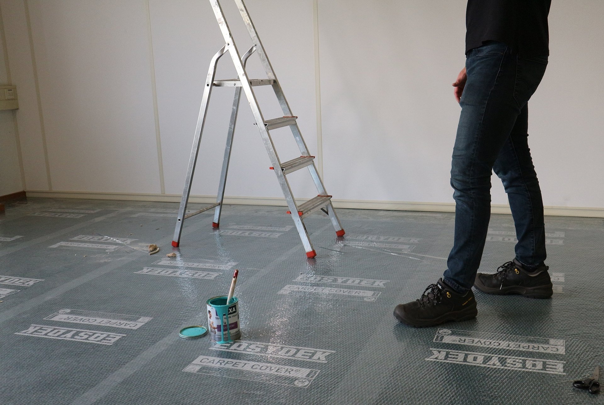 BEGINNEN: verwijder de buitenste folieverpakking. Bewaar deze. Rol vervolgens met de hand een strook van ca. 10cm af. Leg de rol op de grond, wrijf de folie aan en rol vervolgens met de hand of voet af. Bij het afdekken van een trap bovenaan beginnen en indien nodig bij een bocht met mesje insnijden.